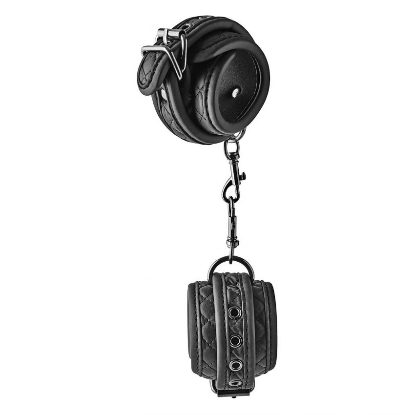 Ця пара наручників із колекції продуктів для бондажу Blaze має чорну ромбоподібну прокладку з веганської шкіри із чорною фурнітурою без вмісту нікелю. Для зручності носіння манжети виконані м'яким, але міцним неопреном. Наручні манжети мають бути у кожного любителя бондажу та популярні серед новачків.