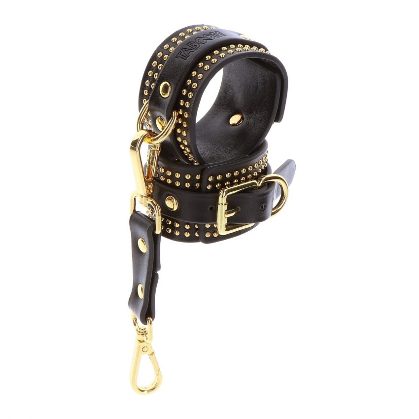 Елегантні чорні наручники прикрашені золотими декоративними елементами для надання розкішного вигляду. Цей вражаючий контраст кольорів підкреслює силу і пристрасть, дозволяючи вам відчути свої найпотаємніші бажання.