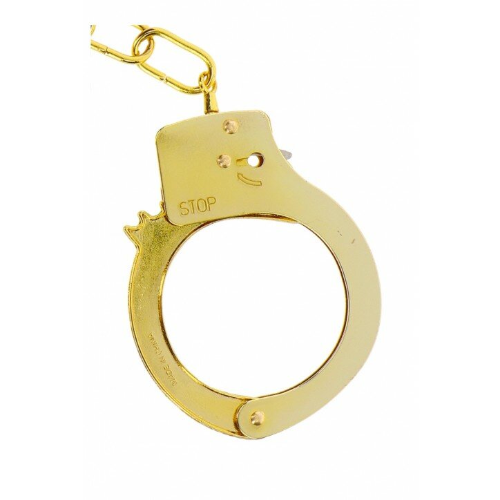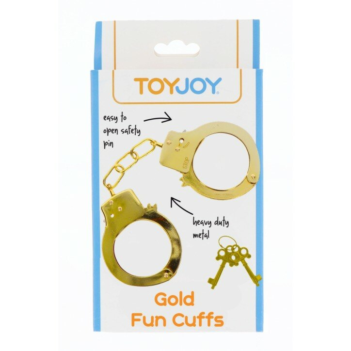 Наручники Toy Joy із золотистого металу регулюються та забезпечені запобіжною клямкою.