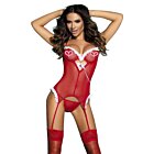 У комплекті з боді йдуть червоні панчохи з підв’язками та мінімалістичні трусики, які прикривають тільки найінтимніше. Панчохи працюють як “рамка” для ніг: вони роблять силует довшим, а підв’язки додають відчуття зібраності й контролю — наче ти спеціально продумала кожну деталь. Розмір універсальний S–L, тож комплект комфортніше сідає, коли ти спокійно підлаштовуєш посадку: вирівнюєш лінію боді, регулюєш підв’язки так, щоб вони тримали панчохи, але не перетискали стегно.