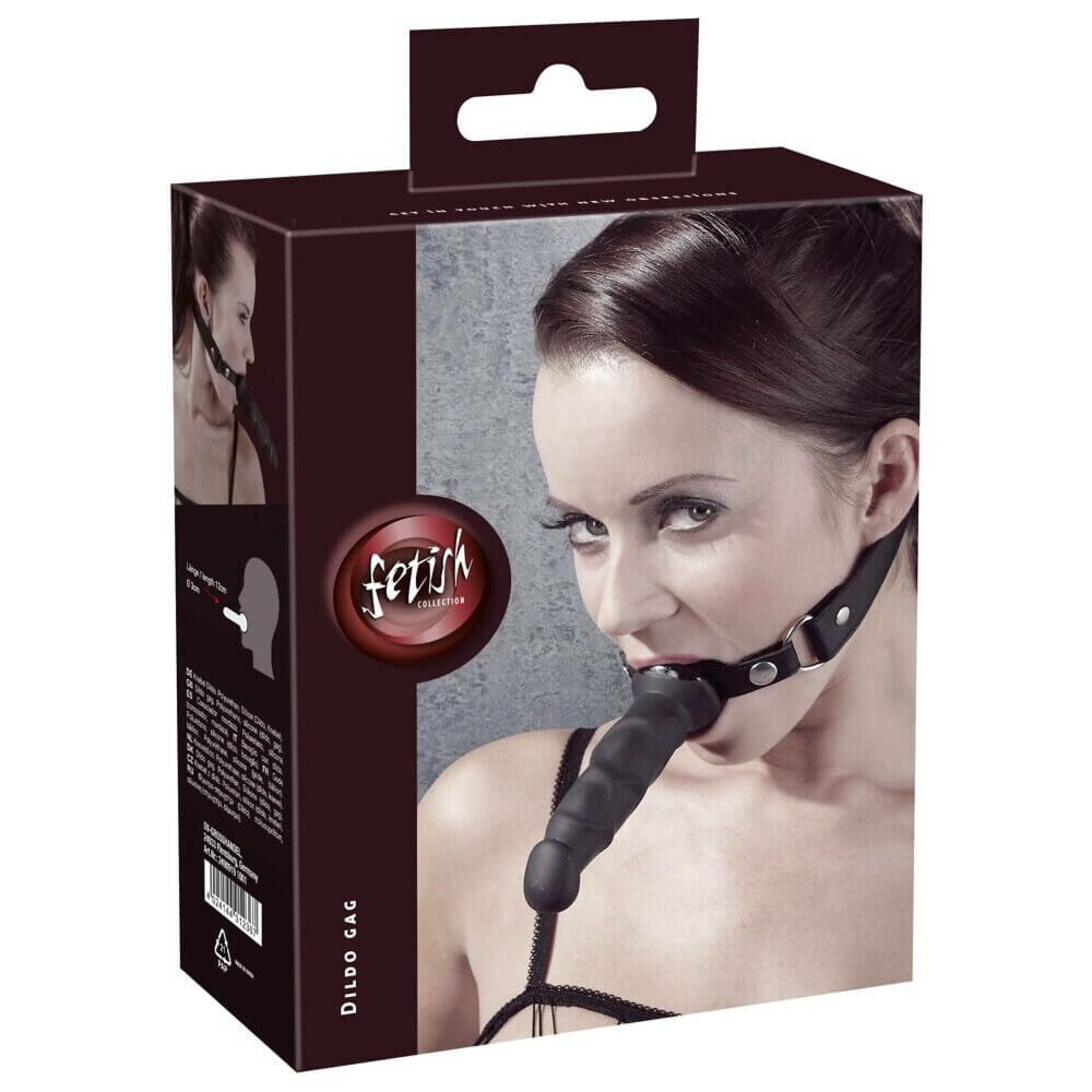 Кляп з фалоімітатором з силікону, довжиною 12 см і діаметром 3 см з одного боку, і напів- кулькою із зворотнього боку. Кріпиться і регулюється за розміром на ремінці із синтетичної шкіри з пряжкою.