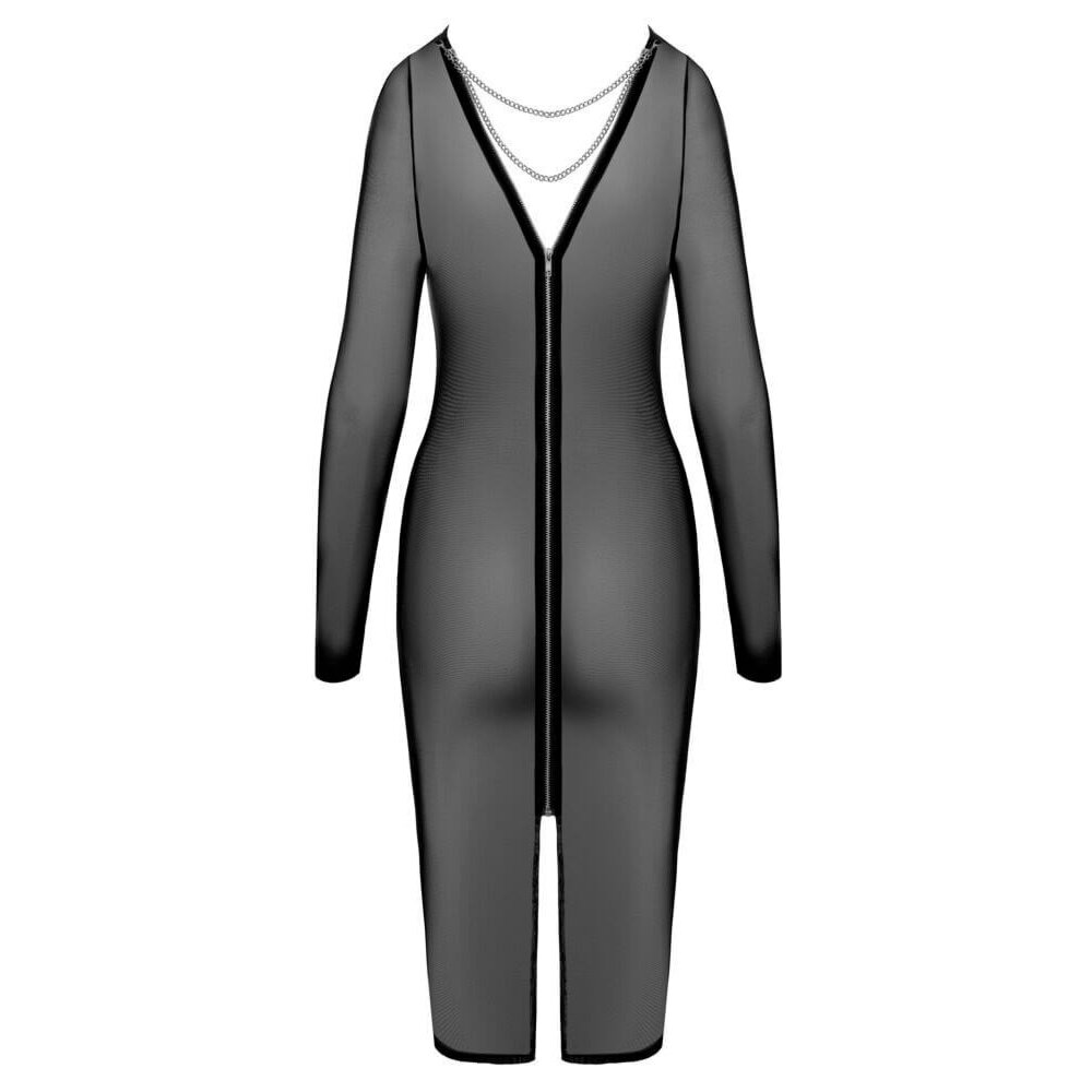 Фішка моделі — спина. Глибокий V-виріз ззаду прикрашений двома сріблястими ланцюжками, які можна зняти, якщо хочеться більш чистого мінімалізму або, навпаки, додати інші аксесуари. По центру ззаду — суцільна блискавка, що йде вниз до розрізу: зручно одягати, легко підганяти посадку, і є та сама «кнопка керування настроєм», коли вирішуєш, наскільки швидко на вечірці перейти від кокетства до сценарію для сексу.