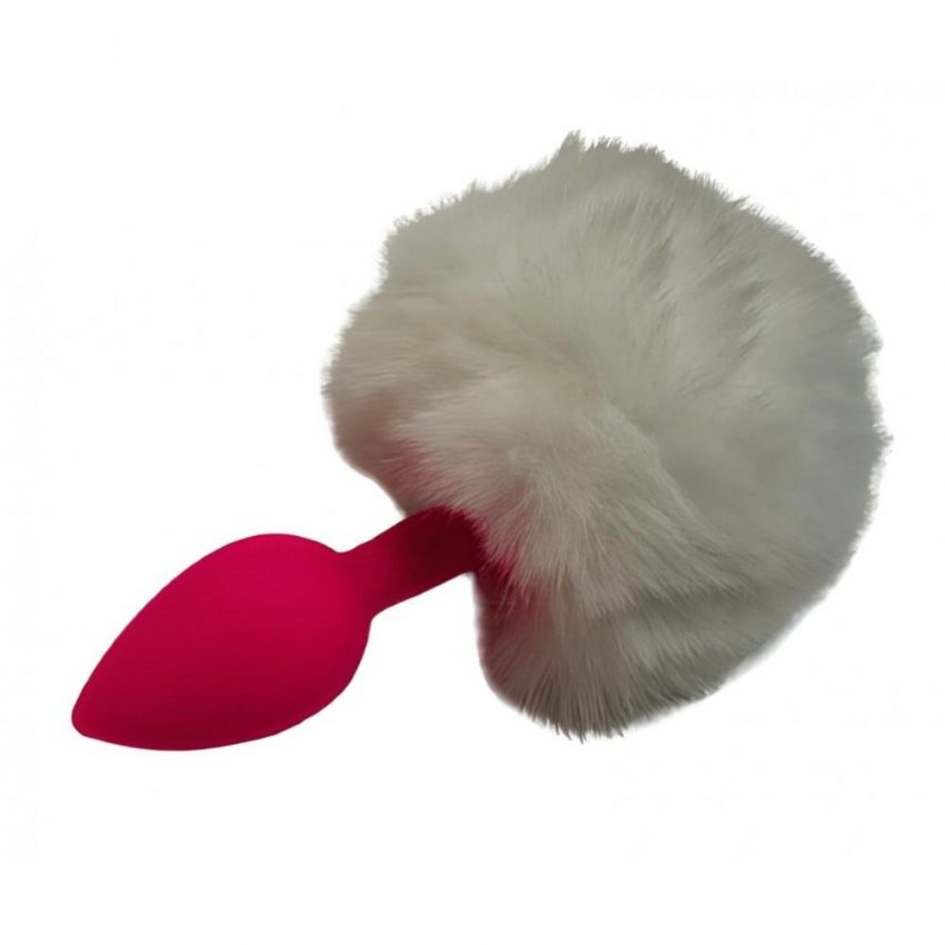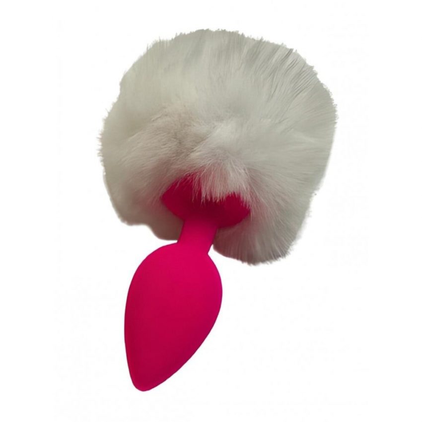 Анальна пробка з білим хвостиком зайчика зі штучного хутра, силіконова, рожева, 7 х 2.8 см