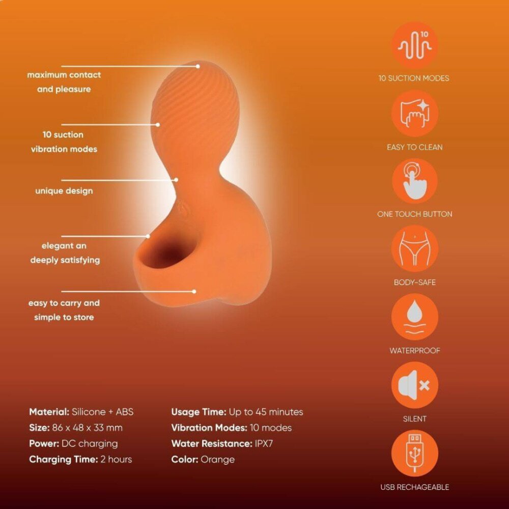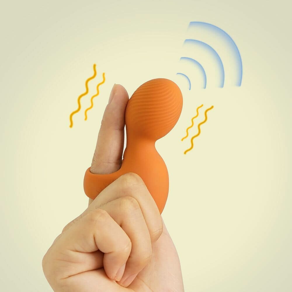 Уяви, що партнер або партнерка ледь торкається пальцями твоєї шкіри, а потім тихо натягує на палець помаранчевий стимулятор. Спершу він ковзає по животу, потім повільно спускається нижче, описуючи кола по внутрішній стороні стегон. У цей момент вмикається вібрація, і кожен наступний рух здається в рази глибшим: короткі доторки біля входу, легкі постукування по найчутливішій точці, повільні кола навколо неї. У будь-якій позі — лежачи, зверху чи збоку — цей маленький девайс легко «влаштується» між тілами, додаючи яскравості як соло-грі, так і спільним експериментам.